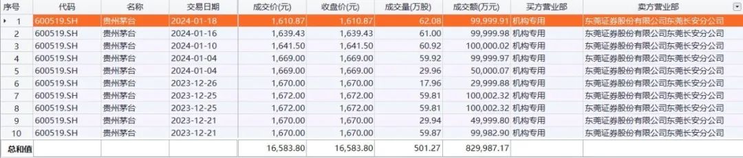 黄桷树财经统计,2023年12月以来,东莞证券东莞长安分公司通过大宗交易累计减持了501.27万股贵州茅台,成交金额合计达到83亿元。