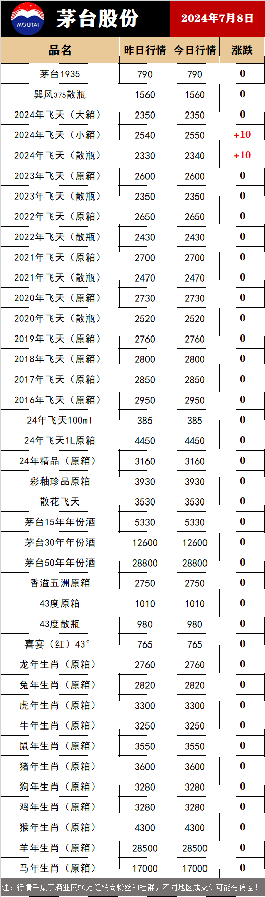 消息面上,7月8日从酒业网发布的白酒价格行情监测数据显示,今日茅台酒行情价:飞天系列,2023~2024年原箱和2024年散瓶涨20~40元/瓶;生肖系列无动价;其他系列,茅台1935涨10元/瓶,散花飞天跌10元/瓶。
