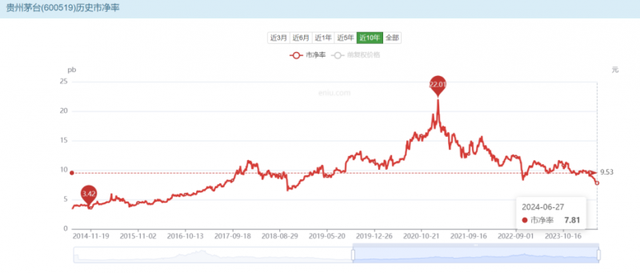 从贵州茅台近十年历史市净率百分位来看,当前处于低谷