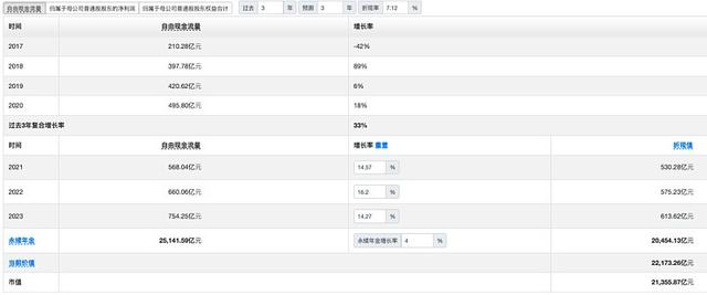 早在2021年8月,也曾使用DCF估值模型估值茅台。彼时,机构对茅台2021-2023年预测的EPS(每股净利润)增速依次为14.57%、16.2%、14.27%,以这个数据模拟自由现金流增速,并继续选取4%的永续年金以及7.12%的折现率,保守估计,代入DCF模型,计算得出的合理市值为22,173.26亿元,对应12.56亿的总股本,每股股价为1765元,与茅台2023年的股价表现相差无几。这也直接证明了DCF估值方法的可靠性、准确性。