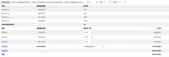 经过输入DCF估值模型,贵州茅台预估市值为29988.64亿元,对应12.56亿的总股本,计算出每股股价为2387元。这表明贵州茅台当前价格被低估。