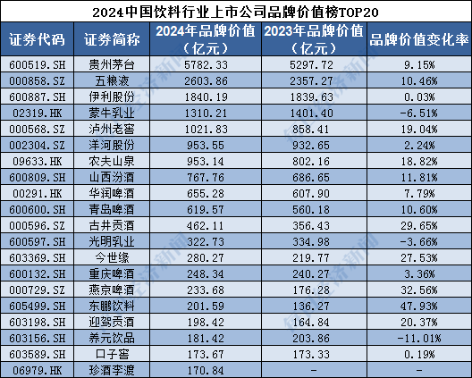 在饮料行业上榜企业中,不乏品牌价值较高者。其中,贵州茅台(SH600519)稳居榜首,品牌价值高达5782.33亿元,连续8年位居饮料行业第一;五粮液(SZ000858)位居第二,品牌价值达到2603.86亿元;伊利股份(SH600887)、蒙牛乳业(HK02319)和泸州老窖(SZ000568)位居三、四、五名,品牌价值分别为1840.19亿元、1310.21亿元和1021.83亿元。