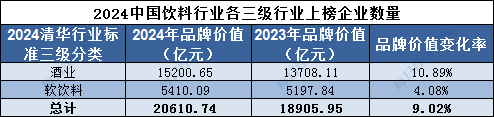 在品牌价值方面,酒业稳居第一,合计品牌价值为15200.65亿元,同比增长10.89%;软饮料排名第二,合计品牌价值为5410.09亿元,同比增长4.08%。