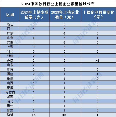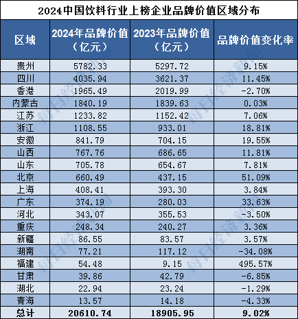 “2024中国饮料行业上市公司品牌价值榜”的上榜企业来自20个省级区域。