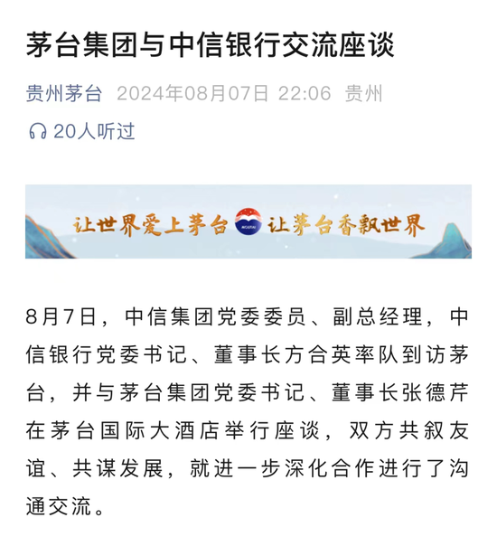 在公布半年度业绩之前,贵州茅台微信公众号曾在8月7日发布消息,称茅台董事长张德芹与到访茅台的中信银行高层进行了座谈,期间谈及的市值管理等话题引起了媒体关注。