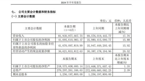 根据8月8日晚间披露的2024年半年报,贵州茅台上半年实现营业收入819.31亿元,同比增长17.76%;实现归母净利润416.96亿元,同比增长15.88%。