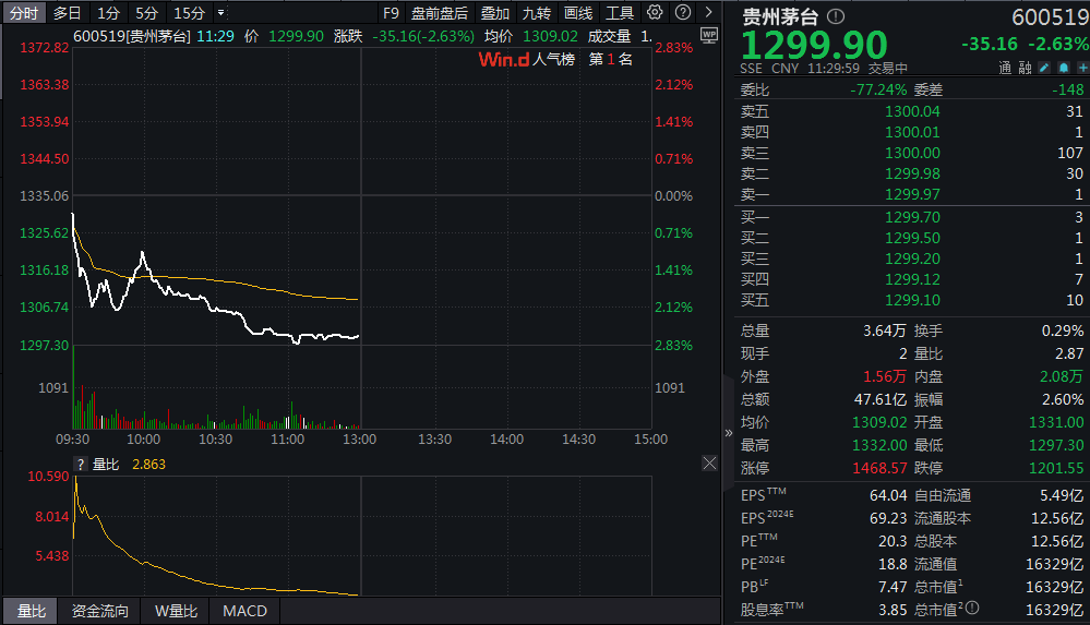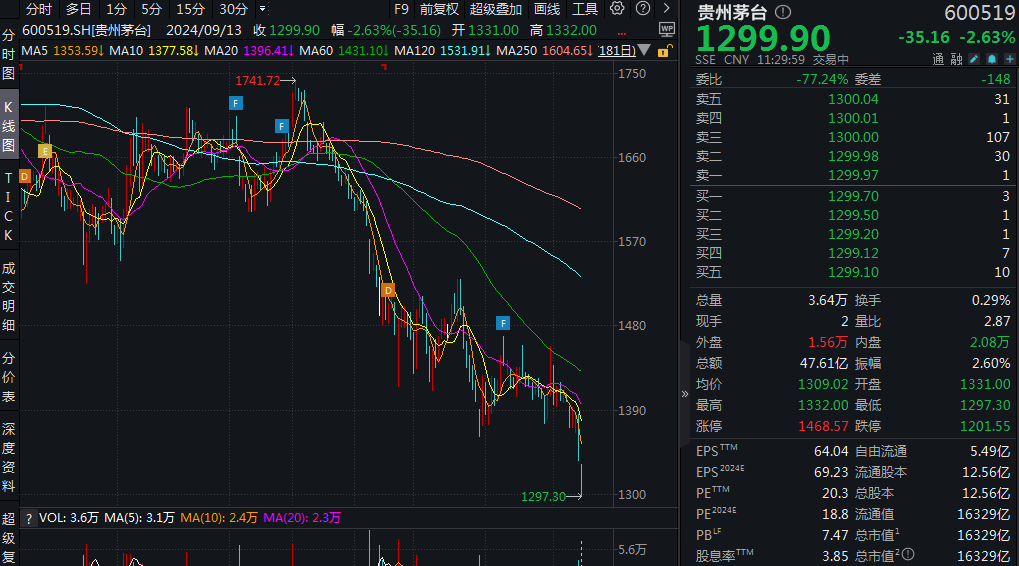 贵州茅台盘中跌破1300元/股,创2022年11月初来新低。
