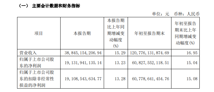 具体到单季度而言,第三季度,贵州茅台实现营业总收入396.7亿元,同比增长15.6%;实现归属净利润191.3亿元,同比增长13.2%。