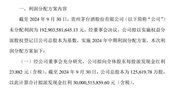 公告显示,贵州茅台拟向全体股东每股派发现金红利23.882元(含税)。截至2024年9月30日,贵州茅台总股本为12.56亿股,合计拟派发现金红利超过300亿元(含税)。