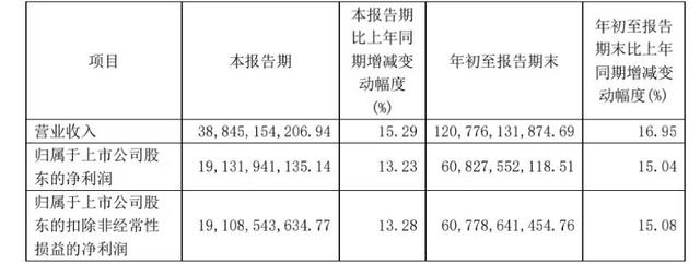 10月25日,贵州茅台披露了2024年三季报,公告显示,第三季度实现营业收入388亿元左右,同比增长15%以上;归属于上市公司股东的净利润约191亿元,同比增长13%左右。