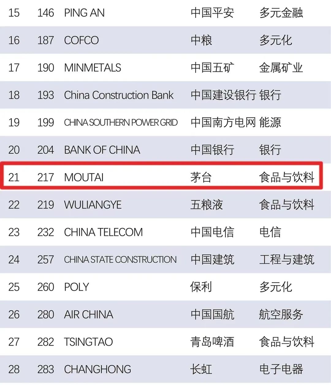 本届榜单中,中国品牌入选数50个,稳居全球第三。与贵州茅台同上榜的中国品牌还有国家电网、腾讯、海尔、华润、中国人寿、中国南方电网等。