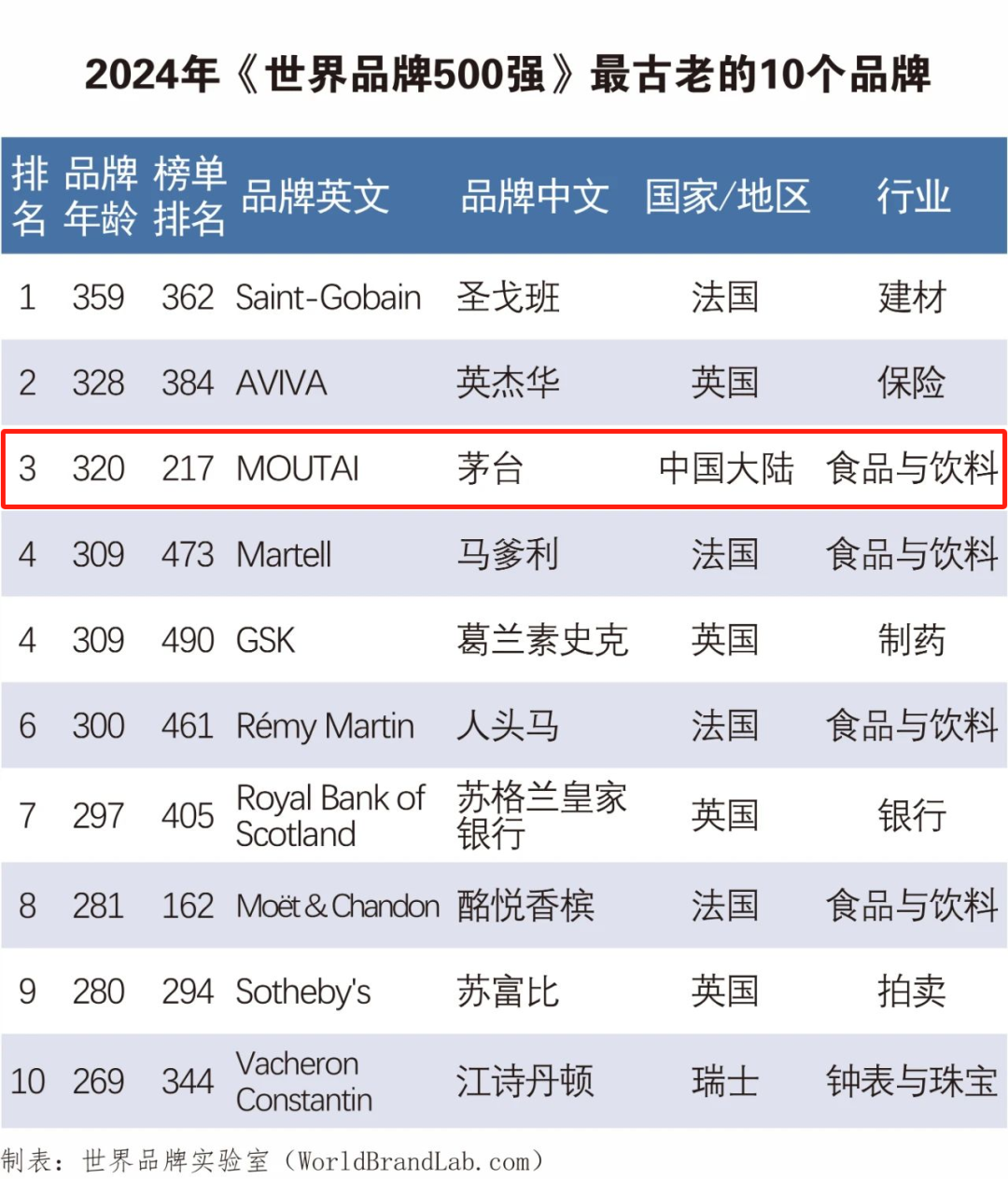 2024年度《世界品牌500强》的平均年龄为99.06岁,相比去年的98.57岁有所增加。其中100岁及以上的“百年老牌”多达225个,占比超过4成。茅台(Moutai)位列品牌年龄第三位,品牌年龄超过300年。