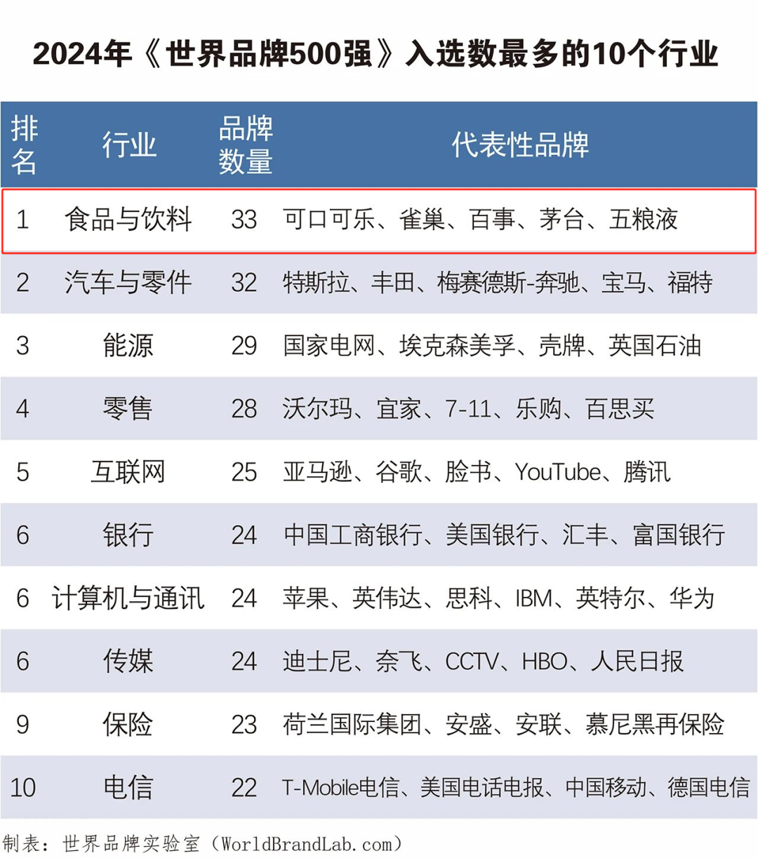 今年《世界品牌500强》共覆盖了49个行业。其中,食品与饮料共有33个品牌上榜,排名第一,贵州茅台也是中国品牌榜单中,食品与饮料行业排名第一位的企业。