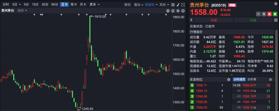 在12月17日的交易日中,沪深两市整体羸弱,而贵州茅台却逆势走高,股价全天上涨2.02%,最终报收于1558元/股。