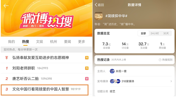 自12月8日开播以来,节目热度迅速攀升。截至12月16日10时,话题#文化中国行看简牍里的中国人智慧#最高登微博热搜主榜TOP3,主话题#简牍探中华#阅读量累计达7.3亿。央视频端内节目累计播放量超过428.3万,视频专辑播放量累计超4463万。