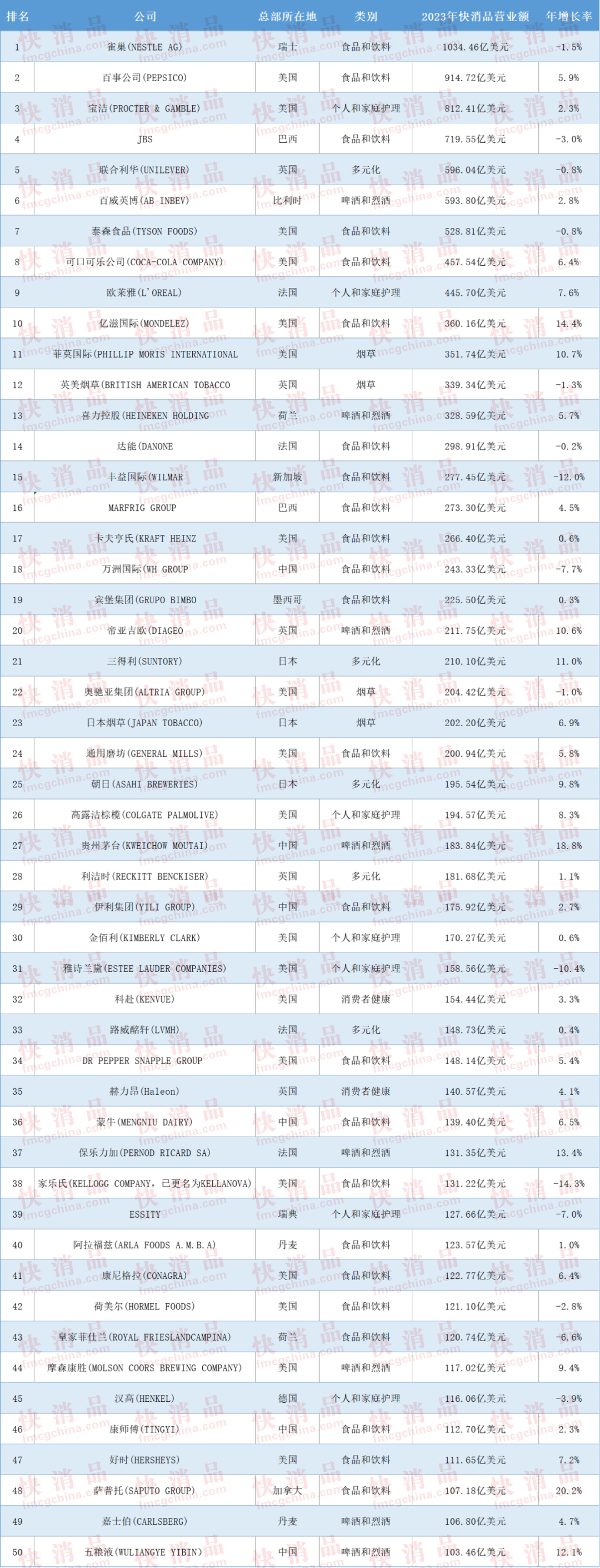 近日,欧晰析企业管理咨询公司(OC C Strategy Consultants)发布了2024年度全球50大快消品企业榜单(THE FMCG GLOBAL 50 2024)。雀巢公司、百事公司和宝洁公司蝉联前三位。共有六家中国企业上榜,分别是:万洲国际、贵州茅台、伊利集团、蒙牛、康师傅、五粮液。