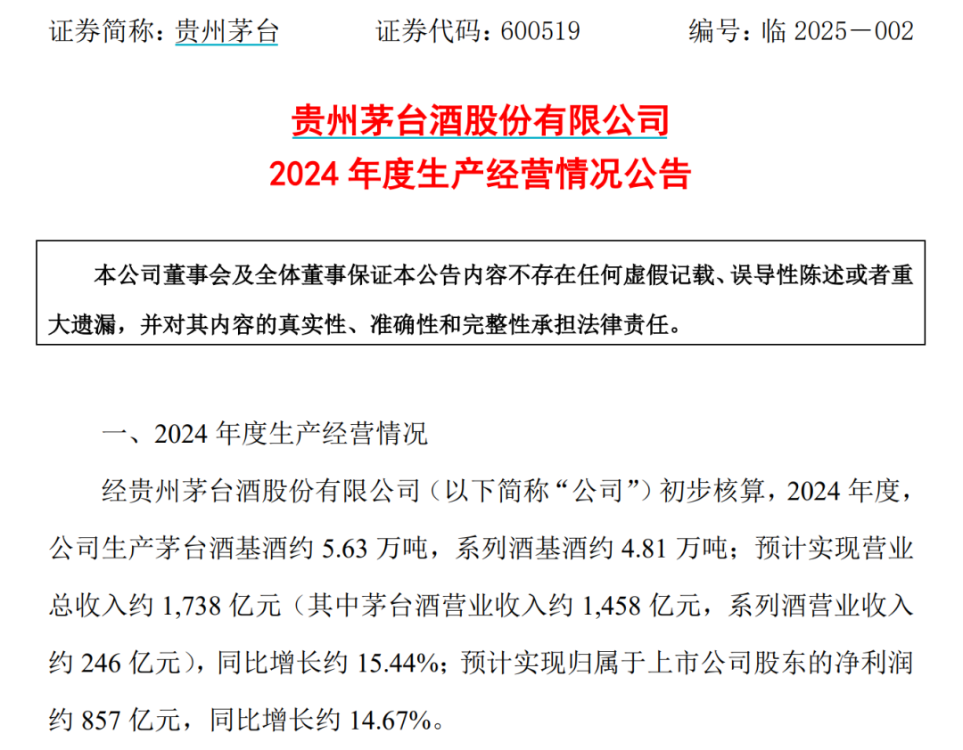 贵州茅台预计实现归属于上市公司股东的净利润约857亿元,同比增长约14.67%。贵州茅台称,上述数据为初步核算数据,未经会计师事务所审计。