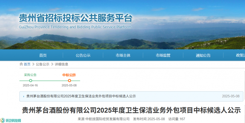 环卫科技网讯,5月8日,贵州茅台酒股份有限公司2025年度卫生保洁业务外包项目中标候选人公示。候选人信息如下: