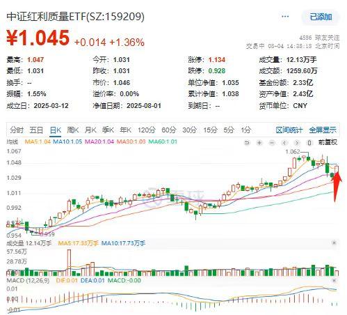 8月4日,两市持续走强。截至14时36分,贵州茅台二度翻红,中证红利质量ETF(159209)涨1.36%,一度涨1.55%引领全市场红利类ETF。