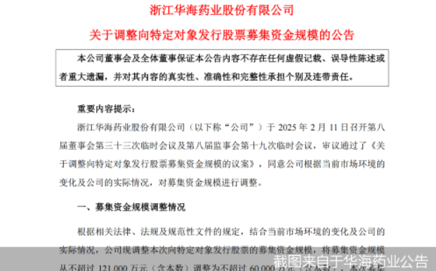 2月12日,华海药业发布公告称,公司于2月11日召开第八届董事会第三十三次临时会议及第八届监事会第十九次临时会议,审议通过了《关于调整向特定对象发行股票募集资金规模的议案》,同意公司根据当前市场环境的变化及公司的实际情况,对募集资金规模进行调整。