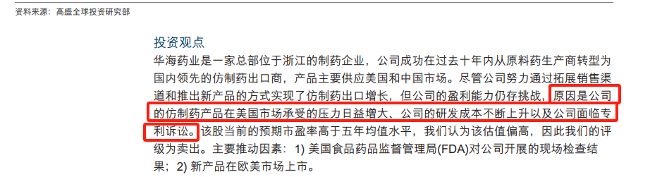 今年初,高盛分析师曾下调华海药业的目标价。1月22日,高盛分析师出具研报提到,华海药业的盈利能力存挑战,原因是该公司的仿制药产品在美国市场承受的压力日益增大、研发成本不断上升以及面临专利诉讼。