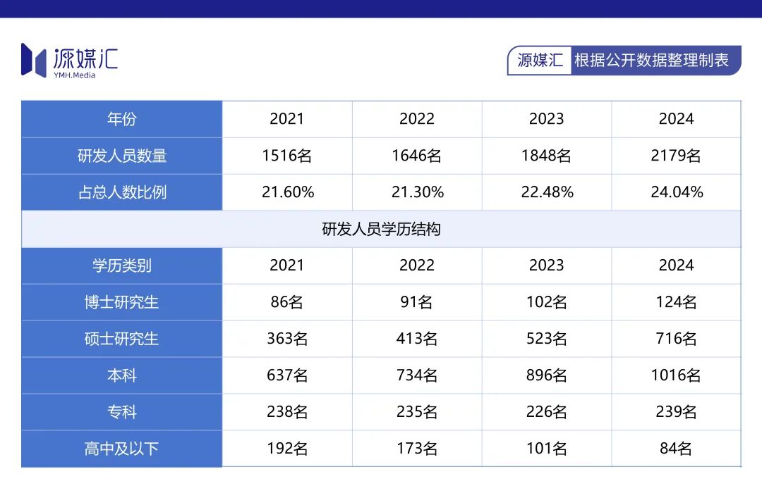 华海药业研发投入稳步攀升的同时,研发人员规模也在持续扩张——2021年1516人的研发团队,到2024年已壮大至2179人,四年间规模扩容超43%,占总员工比例从21.60%跃升至24.04%。