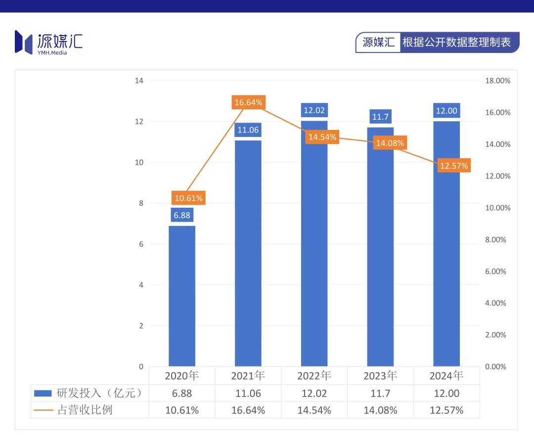 从研发投入轨迹,可以清晰窥见华海药业向创新药转型的战略决心。2021年,华海药业斥资5亿元在上海张江设立创新药研发中心,公司研发投入骤增至11.06亿元,营收占比跃升至16.64%。此后三年,尽管仿制药业务受集采冲击,华海药业的研发投入仍稳守11亿-12亿元区间,占营收比例维持在12%以上的双位数水平。