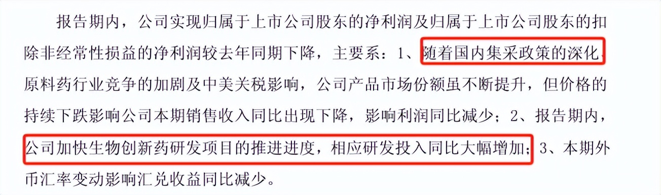 具体来看,经华海药业财务部门测算,上半年公司净利润预计在3.74亿-4.49亿元,相较上年同期减少40%-50%。造成利润下滑的原因主要有三个:集采及关税、研发投入增加和汇兑收益减少。