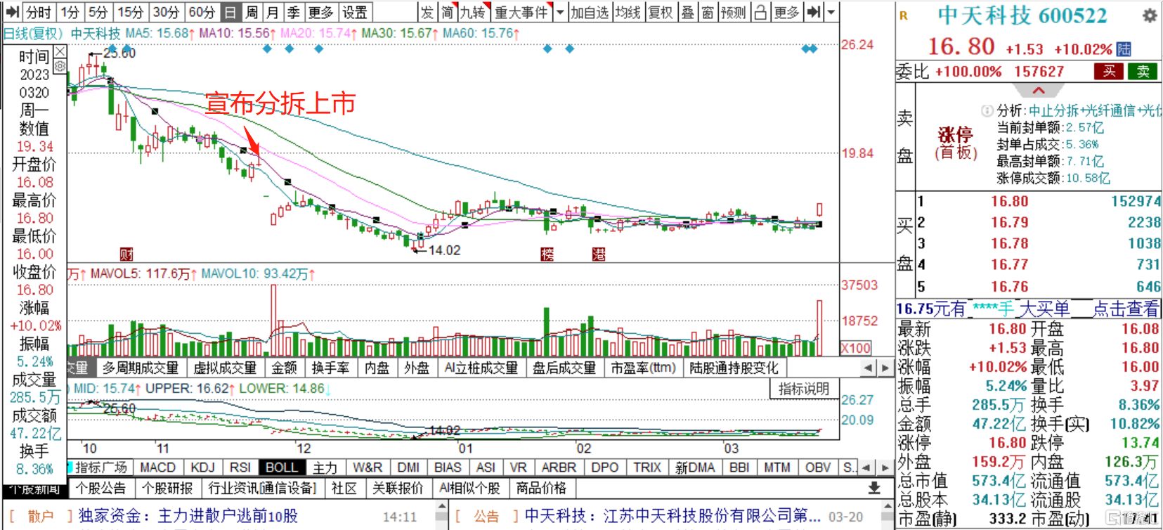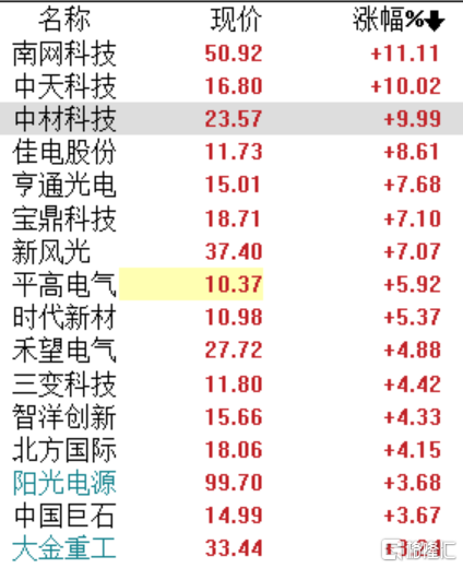 今日,风电股表现不错。受终止分拆上市消息影响,中天科技今日放量涨停,涨停成交额10.58亿元,当前封单额2.57亿元。南网科技涨超11%,中材科技涨停,佳电股份涨超8%,亨通光电、宝鼎科技涨超7%。