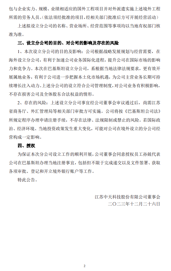 2023年12月26日,中天科技发布《关于设立巴基斯坦分公司的公告》。