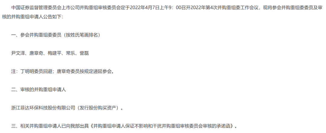 4月7日,浙江菲达环保科技股份有限公司(下称“菲达环保”)发行股份购买资产事项将接受证监会并购重组委的审核。