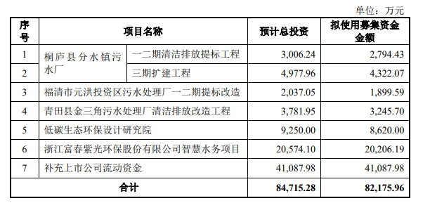 同时,菲达环保还拟募集配套资金不超过8.21亿元,拟用于投入桐庐县分水镇污水厂一二期清洁排放提标工程项目、桐庐县分水镇污水厂三期扩建工程项目等多个项目。