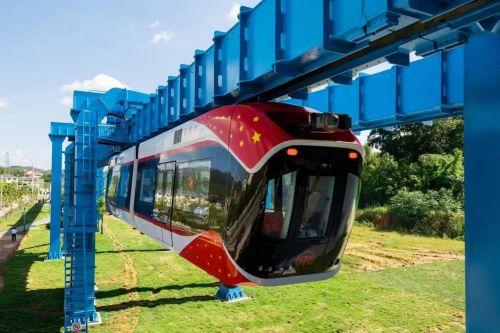 中铁科工为该项目研制的“兴国号”车辆采用2节编组,额定载客人数为88人,最高设计运行速度为80km/h,具有节能环保、非接触式牵引、爬坡能力强、转弯半径小、噪音低等特点。中铁宝桥为该项目设计制造的永磁悬挂式单开道岔,首次将永磁悬浮技术、回转转辙型式融合应用于悬挂结构道岔制造中,实现了悬挂式永磁单轨稳定可靠换线,填补了该领域空白。中铁九桥建设了“红轨”项目站房、静调库,以及沿线区间轨道梁桥全线混凝土桥墩、桩基、承台等土建工程施工任务。