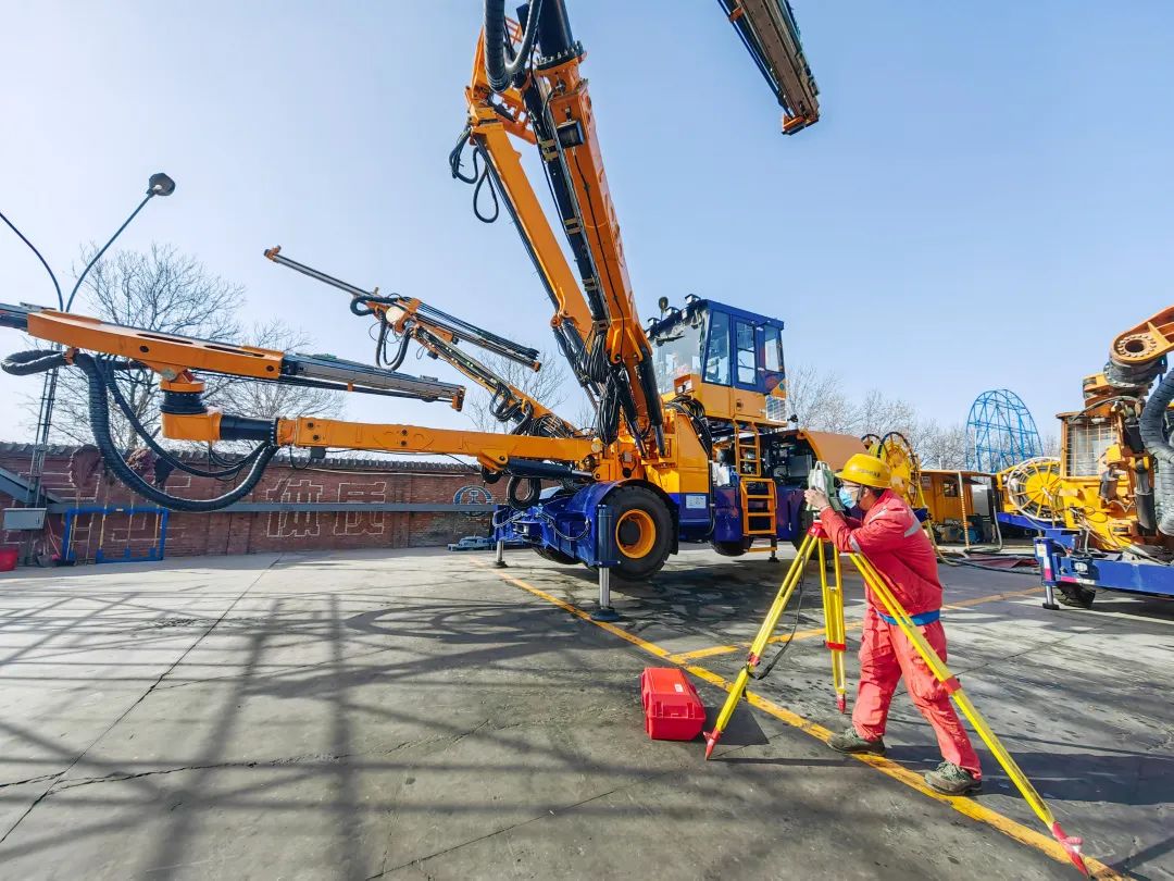 ▲使用全站仪校准智能型三臂凿岩台车控制精度