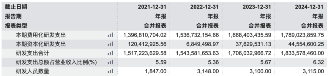 2022年-2024年研发投入逐年增加,分别为14.43亿、17.06亿、18.33亿,占当期营业收入比例为5.36%、5.67%、6.32%。