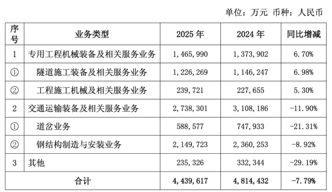 2024年新签合同显示,公司有两大业务——专用工程机械设备和交通运输设备,其中属于专用工程机械设备的隧道施工装备新签合同金额下滑是最明显的,同比下降了23.59%。