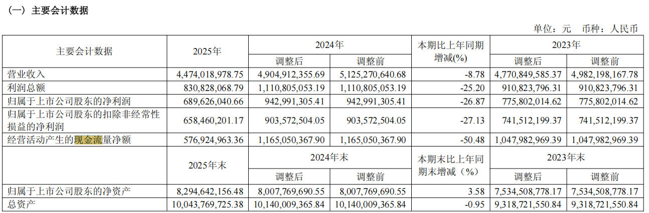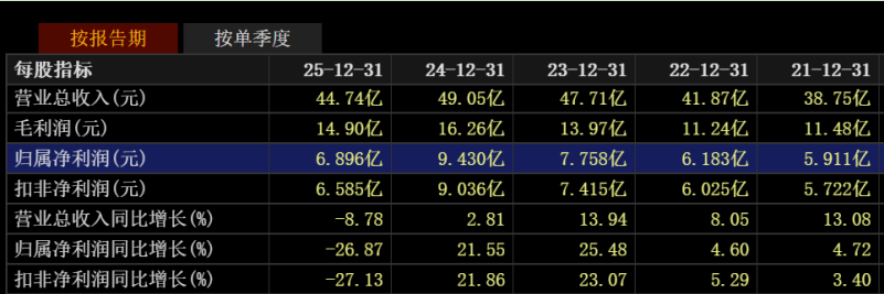3月7日,山东药玻发布了2025年年报。报告显示,公司业绩整体表现为营业收入和净利润双降。2025年,山东药玻的营业总收入为44.74亿元,同比下降8.78%;归母净利润为6.9亿元,同比下降26.87%;扣非净利润为6.58亿元,同比下降27.13%。同期,公司经营活动产生的现金流量净额仅为5.77亿,同比大降50.48%。