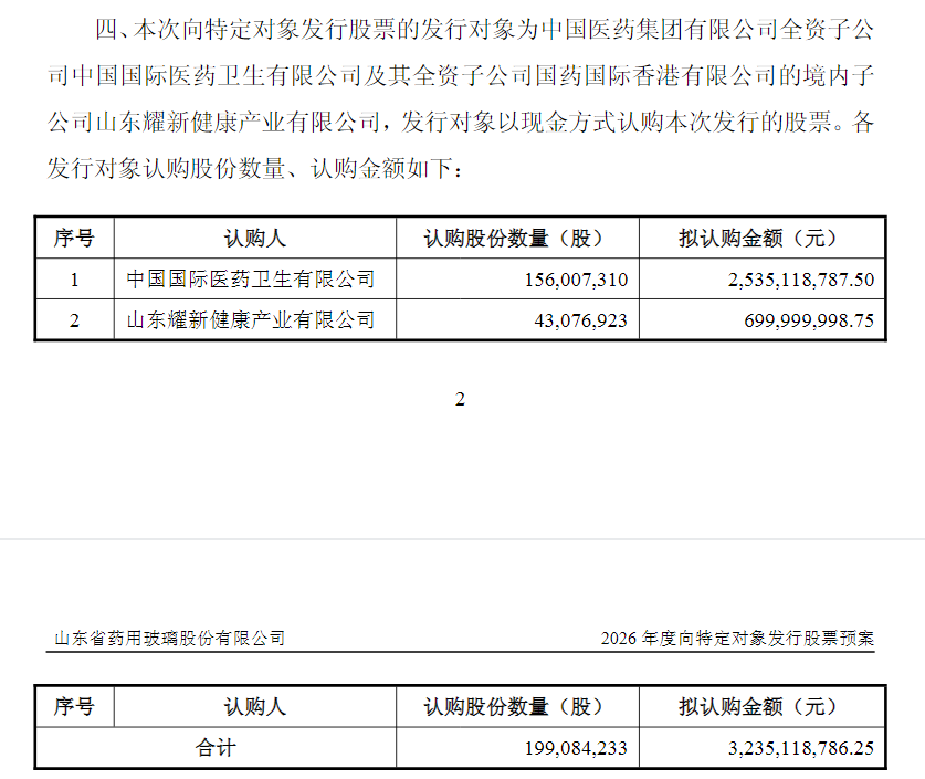 2025年1月,山东药玻首次披露,沂源县人民政府正与国药国际筹划控股股东鲁中投资的重组事宜,可能导致公司间接控股股东变更。当年6月,相关方签署投资合作协议,计划由国药国际及其香港子公司向鲁中投资增资并持股51%,若顺利实施,国药集团将通过鲁中投资间接控制山东药玻19.5%的股份,成为公司间接实控人。2026年1月13日晚间,山东药玻将增资入股方案变更为定增入股。根据公告,山东药玻拟向国药国际及其全资子公司山东耀新发行不超过1.99亿股A股,募资不超过32.35亿元,全部用于补充流动资金。