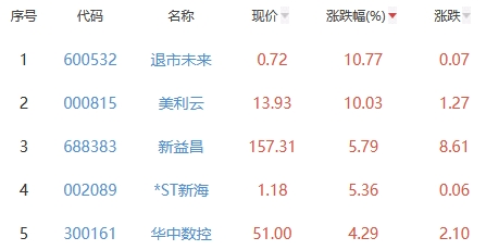 其中,退市未来、美利云、新益昌、*ST新海、华中数控位列板块涨幅前五位,涨幅分别为10.77%、10.03%、5.79%、5.36%、4.29%。