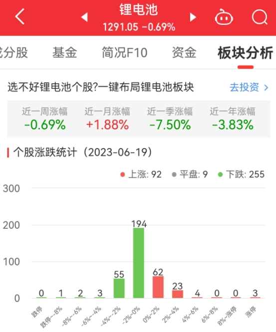 今日,锂电池板块整体跌幅0.69%,其中92只股票上涨,9只股票平盘,255只股票下跌。