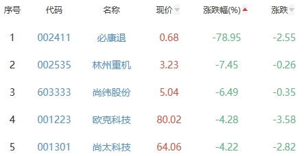 必康退、林州重机、尚纬股份、欧克科技、尚太科技位列涨幅榜后五位,涨幅分别为-78.95%、-7.45%、-6.49%、-4.28%、-4.22%。