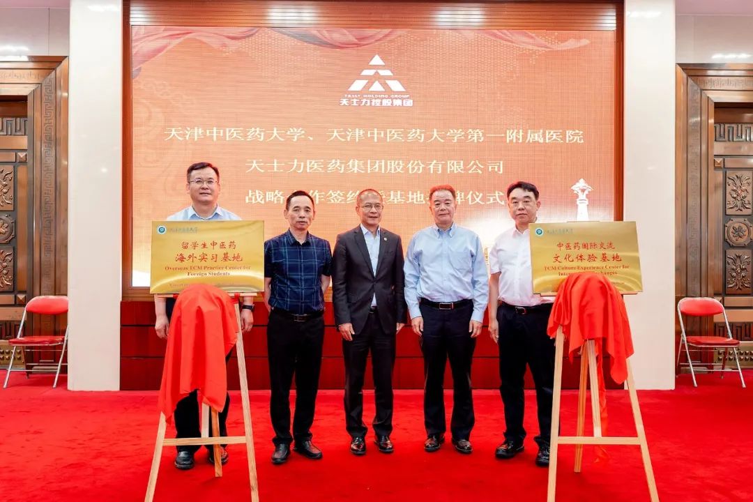 2023年6月1日,天津中医药大学、天津中医药大学第一附属医院与天士力医药集团股份有限公司战略合作签约仪式暨基地揭牌仪式在天士力集团成功举办。天津市商务局服贸处处长徐立华,天津市卫生健康委员会中医处处长于春泉,天士力控股集团总裁朱永宏,天津中医药大学副校长王耀刚,天津中医药大学第一附属医院副院长赵强,天士力医药集团股份有限公司常务副总经理蔡金勇,天士力医药集团股份有限公司国际事业部总经理范浩,以及天津中医药大学、天津中医药大学第一附属医院等相关领导出席了签约活动。