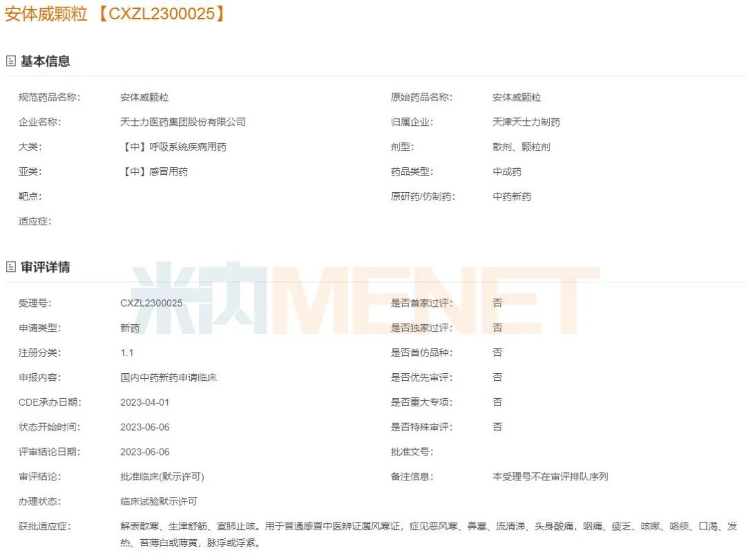 近日,天士力公告称,公司的1.1类中药创新药安体威颗粒获批临床,用于普通感冒(风寒证)。感冒中药创新药是热门研发领域,米内网数据显示,2022年中国三大终端六大市场感冒中成药销售额超过250亿元,同比增长38.85%。