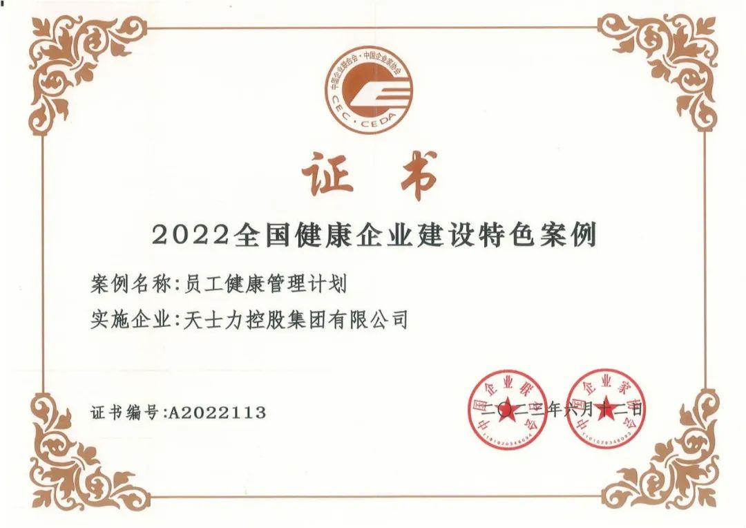 此次入选“2022年全国健康企业建设特色案例”,体现了各界对天士力“健康企业”建设工作的高度肯定。未来,天士力将锚定“健康员工、健康家庭、健康企业、健康社会、健康中国”的长远目标,通过不断完善健康企业体系建设,改善企业环境,打造企业健康文化,提升健康管理和服务水平,坚定践行“共建共生,构建全球生命健康价值生态”的企业愿景,为建设“健康中国”贡献力量。