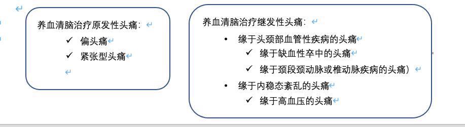 单用养血清脑,可减少头痛发作次数、持续时间及头痛程度,总有效率优于安慰剂及其他阳性药物。
