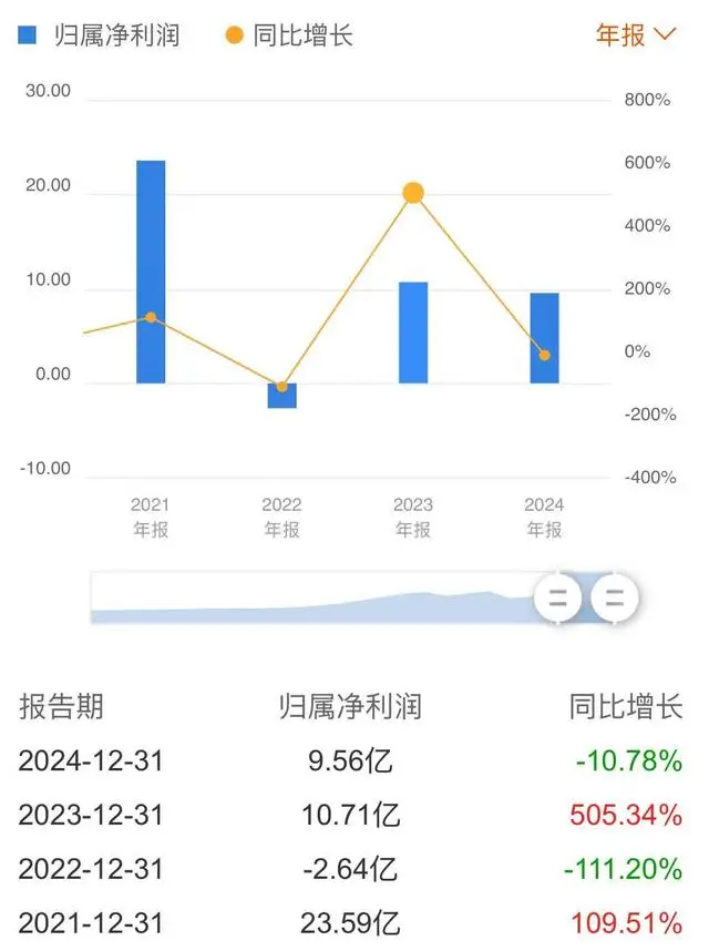 财务数据显示,2021~2023年,公司营业收入分别为79.52亿元、86.37亿元、86.74亿元,2021年同比下降41.43%,随后两年分别小幅增长8.62%和0.42%。归母净利润方面,公司近三年分别实现盈利23.59亿元、亏损2.64亿元、盈利10.71亿元,同比分别增长109.51%、下降111.2%、增长505.34%。