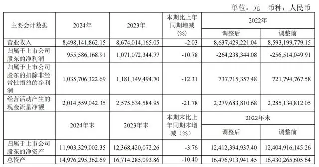 2月24日晚,天士力(600535)发布2024年度报告,2024年公司实现营业收入85亿元,同比下降2.03%;归母净利润为9.56亿元,同比下降10.78%;扣非归母净利润为10.4亿元,同比下降12.31%;经营现金流净额为20.15亿元,同比下降21.78%。