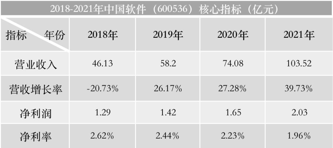在2019年年报中,中国软件曾提出2020年要实现营收100亿元的目标,由于疫情影响项目招标工作,该目标彼时并未达成。2021年,中国软件实现营业收入103.52亿元,延期交上了答卷。