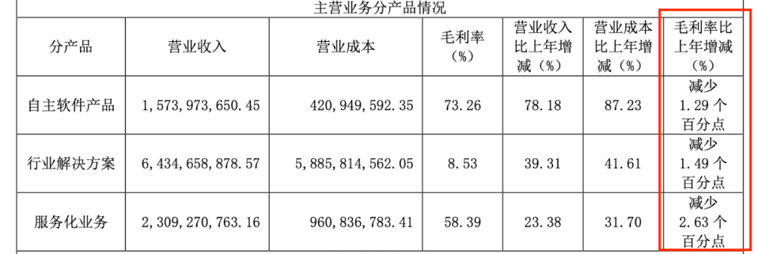 中国软件三大业务板块分为:自主软件产品、行业解决方案和服务化业务。当前,三大业务板块均出现营收增长,毛利率却下降的难题。
