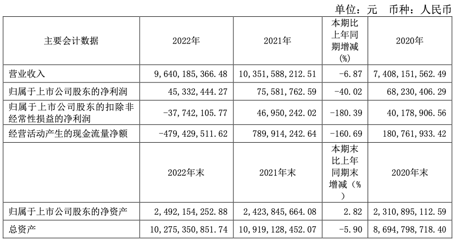 2022 年营收 96.4 亿,同比减少 6.87%;净利润 4532 万,同比减少 40.02%。